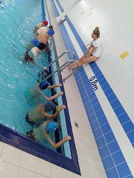 Na zdjęciu widoczni młodzi pływacy i instruktor.