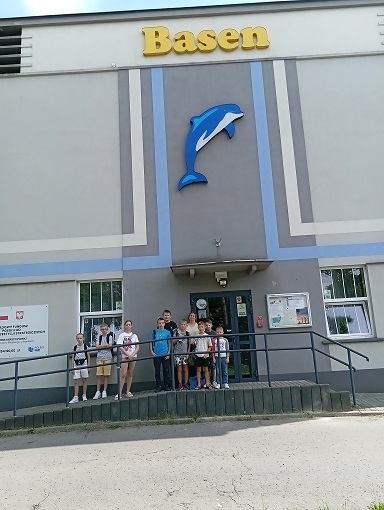 Fotografia przedstawia dzieci przed basenem POSIR w Pionkach
